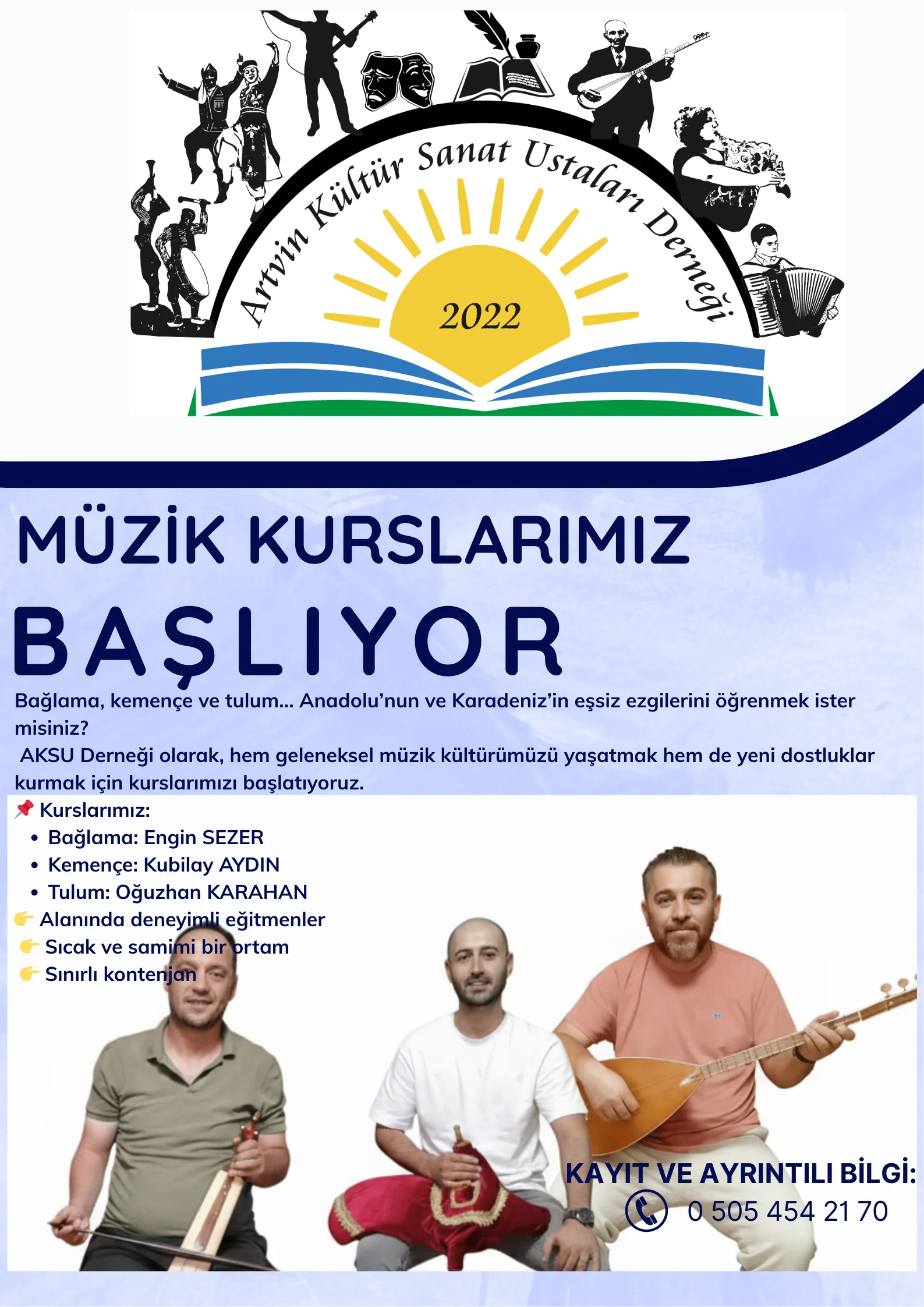 Artvin Kültür Sanat Ustaları Derneği (AKSU), kültürel mirasımızın temel unsurlarından olan geleneksel müzik enstrümanlarını yaşatmak ve gelecek kuşaklara aktarmak amacıyla eğitim faaliyetlerini sürdürmektedir. Bu kapsamda dernek bünyesinde Bağlama Kursu, Kemençe Kursu ve Tulum Kursu düzenlenmektedir.